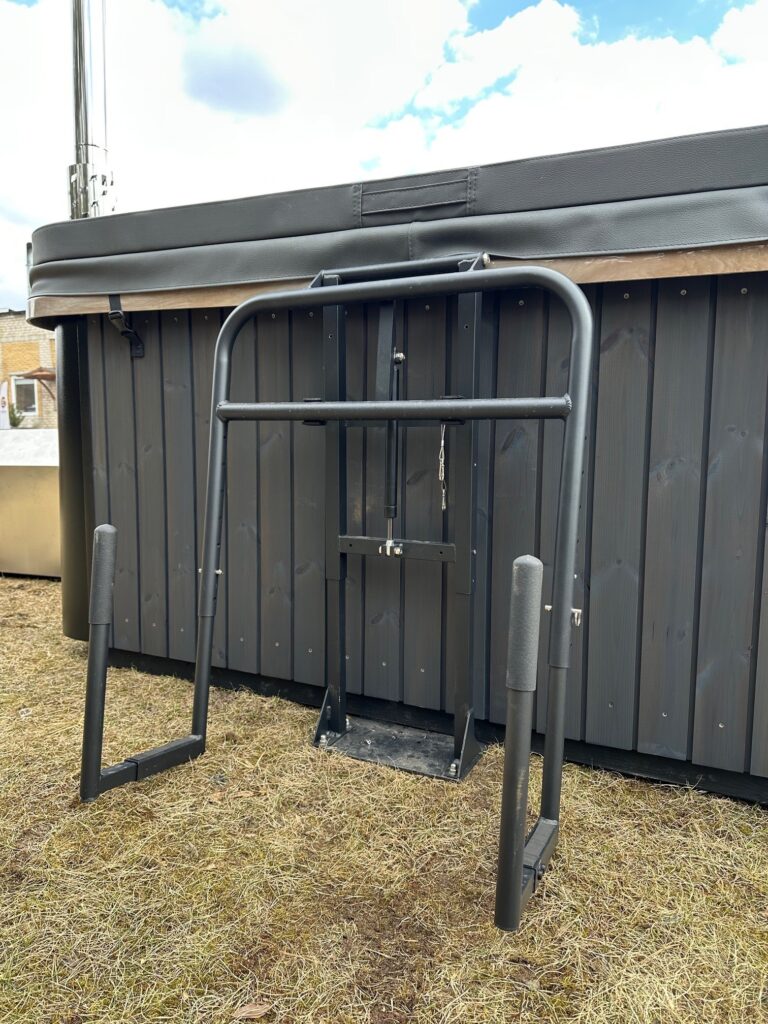 - Termo dangtis pasiūtas iš eko odos, viduje drėgmei atsparus putų polistirolas, sutvirtintas cinkuotu profiliu. Dangtis yra su nuolydžiu, per vidurį dangtis yra 10 cm, o kraštuose 7 cm. Atsparus ugniai ir UV spinduliams