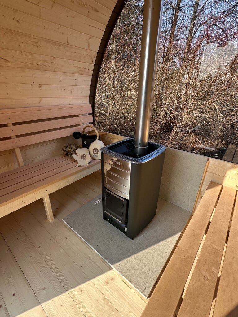 - Malkinė krosnelė su išorės pakūra lauke arba persirengimo kambaryje.