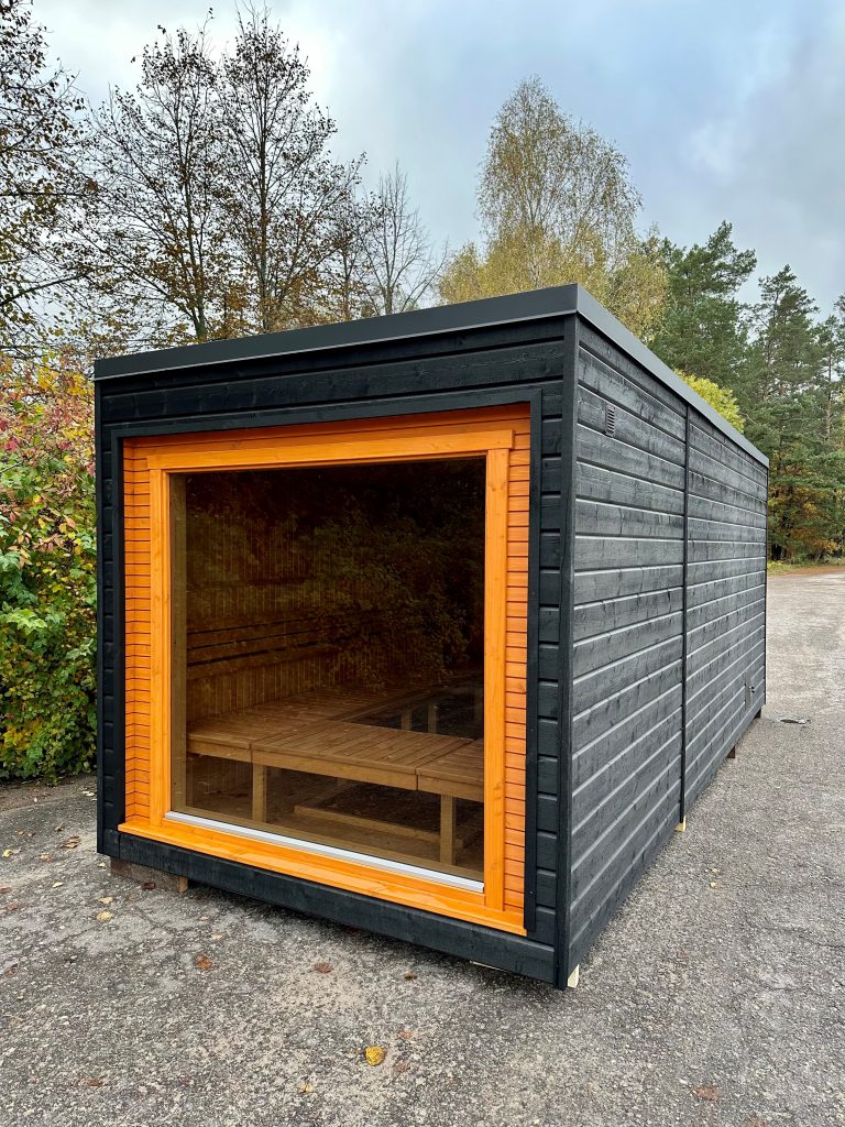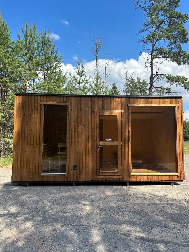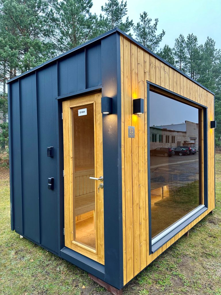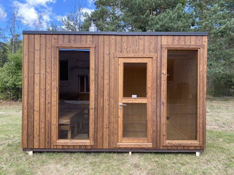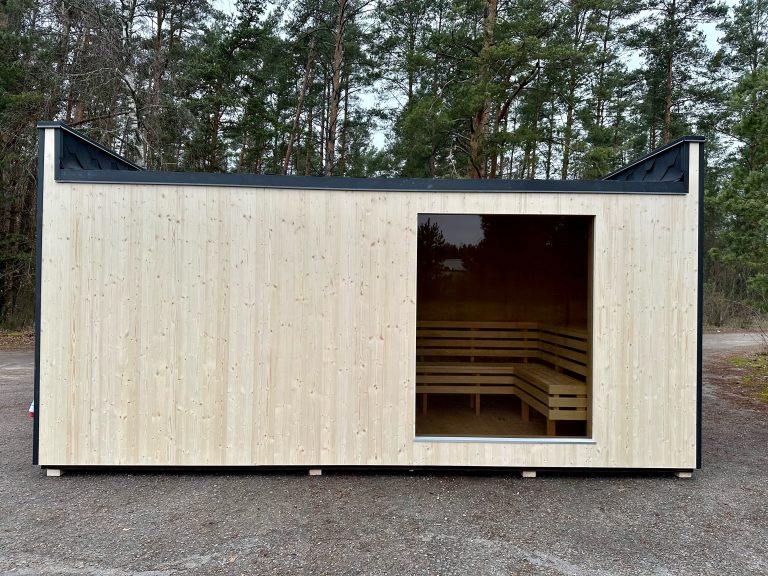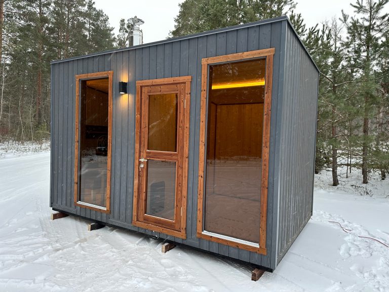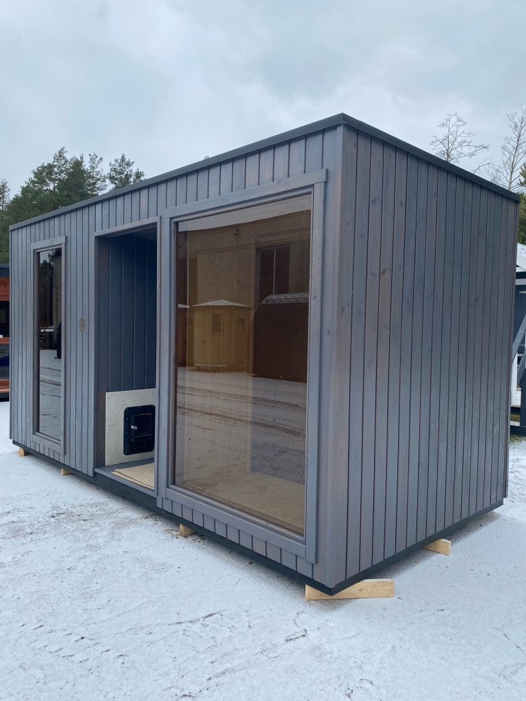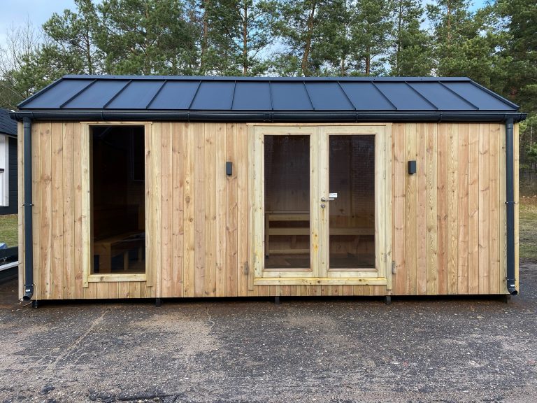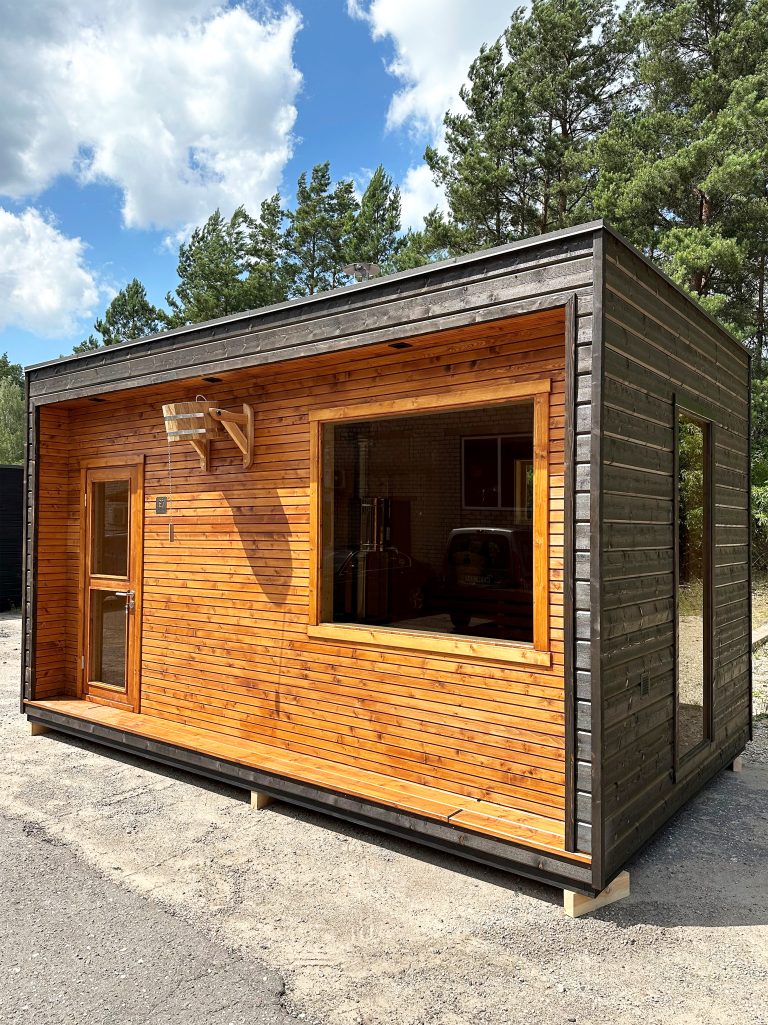 Nauja, modernaus dizaino karkasinė pirtis, kuri pasakiškai atrodys Jūsų kieme. Dideli, bei tamsinti grūdinto stiklo langai šiai saunai suteikia stilingą ir šiuolaikišką išvaizdą. Erdvi ir jauki poilsio zona puikiai tiks susibūrimams, poilsiui ar laisvalaikiui. Taip pat poilsio kambarį galite paversti laikinu svečių miegamuoju arba visą pirtį pakeisti į mobilų biurą. Sauna ,,Moderno‘‘ gali būti pritaikyta visiems Jūsų poreikiams.