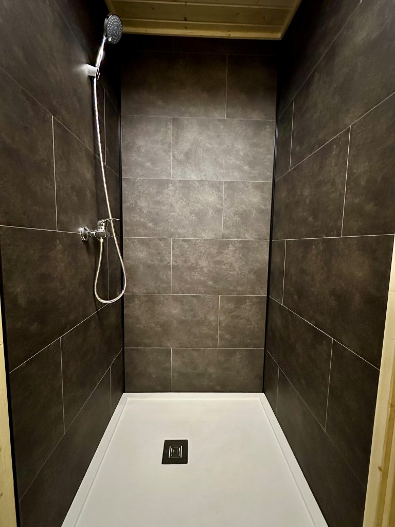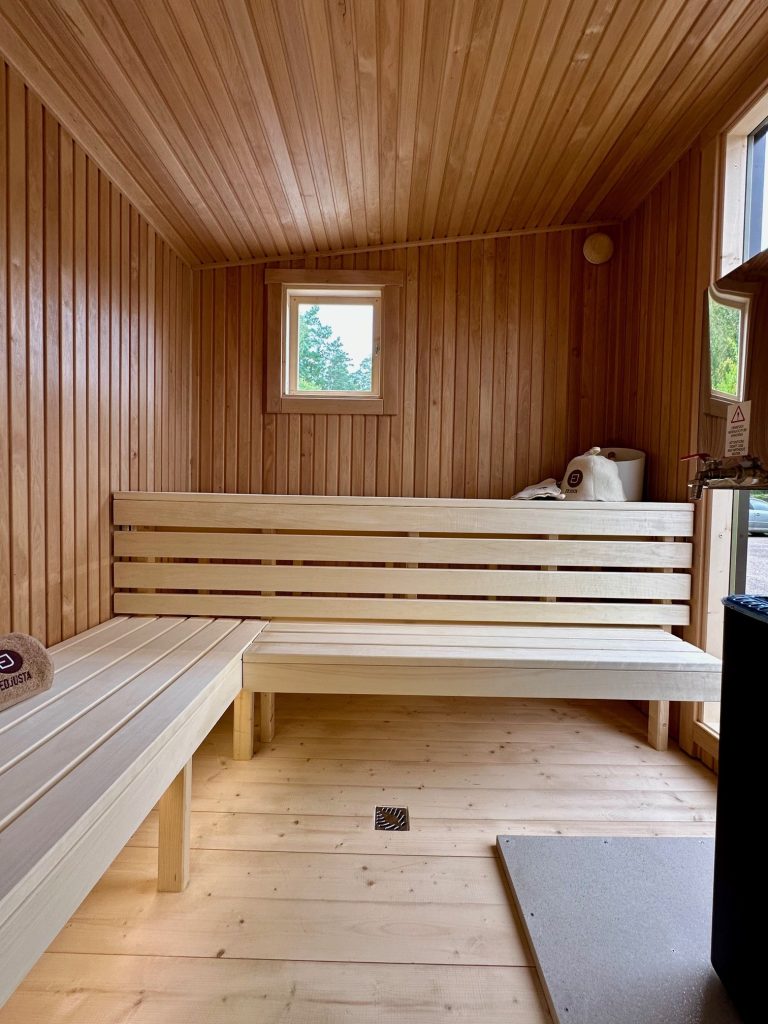 - Saunos patalpoje anga su nuolydžiu grindyse vandens nutekėjimui.